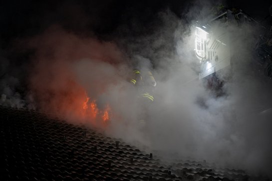 Beim Eintreffen bot sich uns folgende Lage: Flammen schlugen vom Dach, dichter Rauch stand über dem Objekt. Gemeinsam mit den eingesetzten Feuerwehren übernahmen wir den Außenangriff mit mehreren Strahlrohren, stellten Atemschutztrupps und unterstützten beim Aufbau der Wasserversorgung.